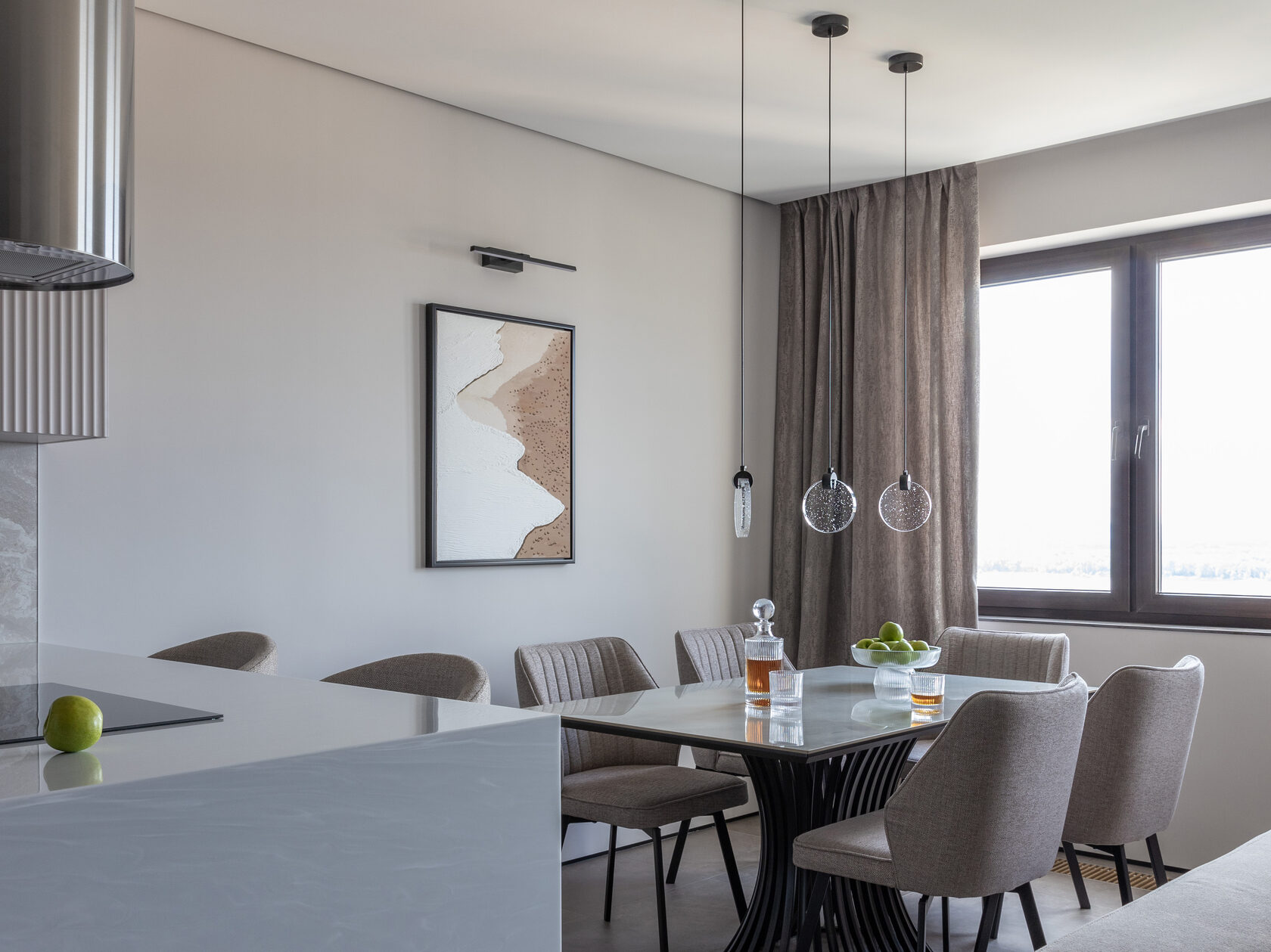 Квартира разделена на 3 функциональные зоны. Первая – это просторная кухня-гостиная с видом на Волгу, входная зона с гардеробными, постирочной и гостевым сан-узлом.