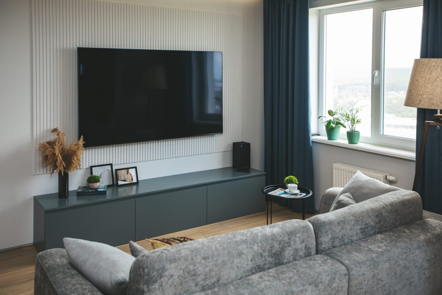 Из окна открывается прекрасный вид на город, поэтому в гостиной нет тюля, основные шторы всегда открыты.
